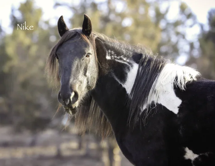 Among the many extraordinary aspects of Blue Zeus’ life is the great love he has always shared with Nike. Never far from each other, they eat their meals together, touching noses as they munch on good hay. At first glance, you might have thought she only had eyes for him with a lower rank in the mare pecking order, but her influence is profound, if subtle. His lead mare in the wild, Nike was the glue that held the mares and foals together at the holding facility. It was her distinctive white swoosh that revealed their presence in that final pen, leading to their adoption. She was the force that welcomed more mares into the fold when we introduced Renegade’s mother, Calypso, and the Golden Girls from South Steens, along with youngsters Curly Girl and Stargazer.